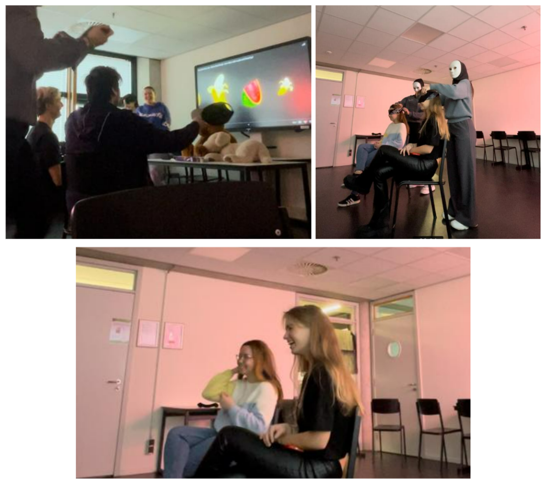 As they were blindfolded, people felt scared and fully immersed by surrounding sounds, blown air, and soft material touching them (picture 1 and 2). Some users expressed their emotions out loud by reacting "Oh S*it!", "Getta f*ck outta here!", but after taking the blindfold off their reactions consisted of yelling things like: "Let's go!!", "Yay!!","OMG", or physical reactions like sighs, dropping their shoulders or nervous/excited laughter. Some people also reacted by mentioning that "It was the best idea" because they were fully immersed in the experience by feeling scared and stressed, and in the end, all the sweat turned into happiness.