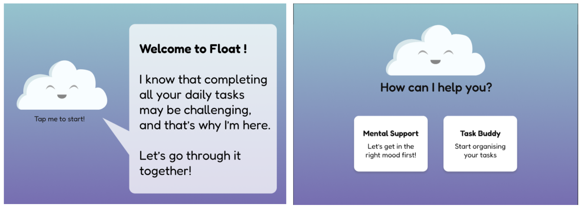 The user can click on "Mental Support" first if needed in that moment, so Float will help by setting the right mood before getting to the action. Otherwise, the user can go straight to "Task Buddy" and start organizing their tasks.